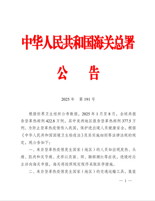 根据世界卫生组织公布数据,2025年1月至8月,全球共报告登革热病例422.8万例,其中美洲地区报告登革热病例377.5万例。为防止登革热疫情传入我国,保护进出境人员健康安全,根据《中华人民共和国国境卫生检疫法》及其实施细则等法律法规的规定,现公告如下: