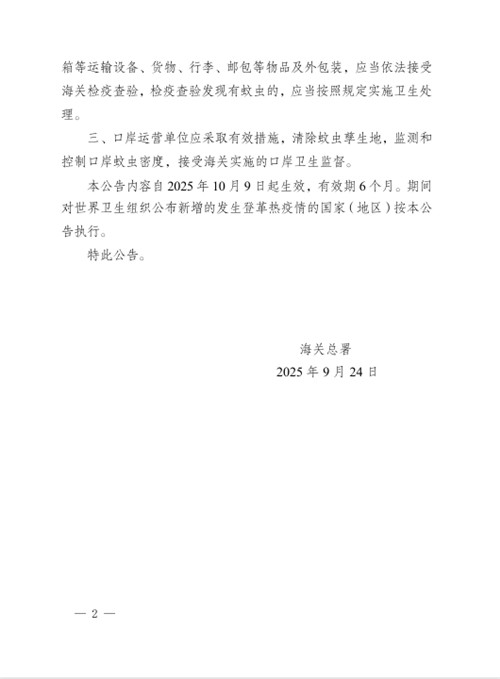 本公告内容自2025年10月9日起生效,有效期6个月。期间对世界卫生组织公布新增的发生登革热疫情的国家(地区)按本公告执行。