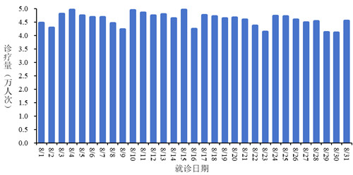 2025年8月1日-8月31日,全国31个省(自治区、直辖市)及新疆生产建设兵团各级各类医疗机构发热门诊(诊室)诊疗量在4.1万至5.0万人次之间波动。见图1。
