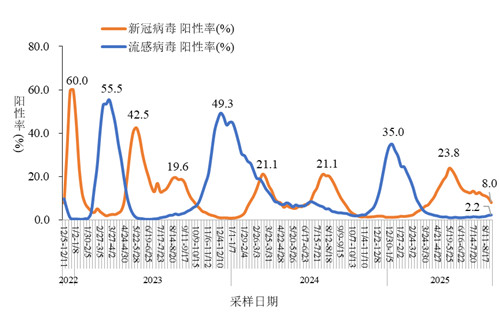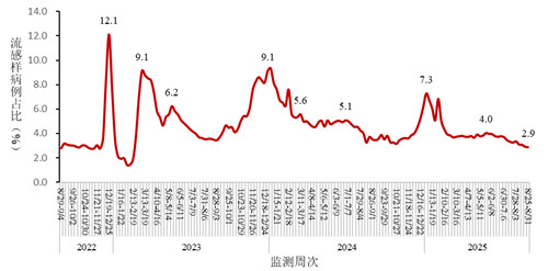 2025年第32周(8月4日-8月10日)至第35周(8月25日-8月31日),流感样病例新冠病毒阳性率持续下降,分别为11.6%、11.1%、10.2%和8.0%。见图4-2。
