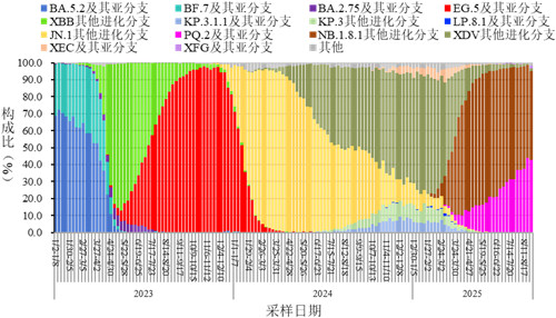 2025年8月1日-8月31日,全国31个省(自治区、直辖市)及新疆生产建设兵团共报送8699例本土病例新冠病毒基因组有效序列,均为奥密克戎变异株。主要流行株为NB.1.8.1及其亚分支(XDV变异株第六代亚分支)。根据采样日期,第32周(8月4日-8月10日)至第35周(8月25日-8月31日)NB.1.8.1及其亚分支占比分别为97.5%、97.8%、98.2%、95.2%。见图5。