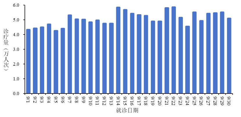 2025年9月1日-9月30日,全国31个省(自治区、直辖市)及新疆生产建设兵团各级各类医疗机构发热门诊(诊室)诊疗量在4.2万至5.9万人次之间波动。见图1。
