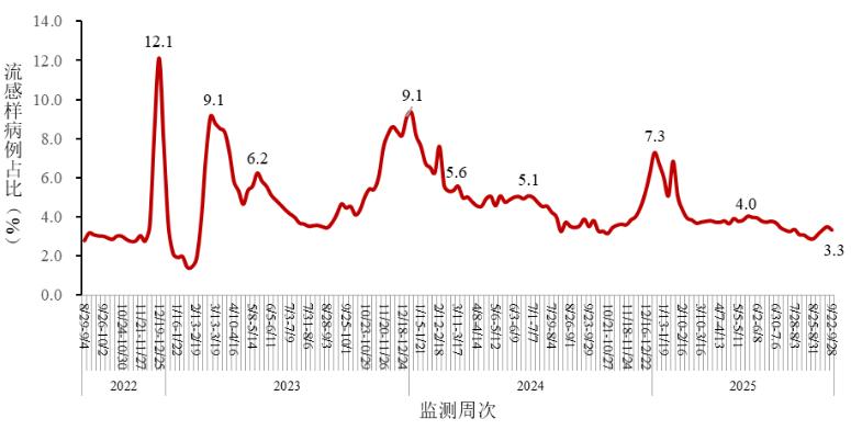 2025年第36周(9月1日-9月7日)至第39周(9月21日-9月28日),全国哨点医院流感样病例占门(急)诊就诊人数比例低水平波动,分别为3.1%、3.3%、3.5%、3.3%。见图4-1。