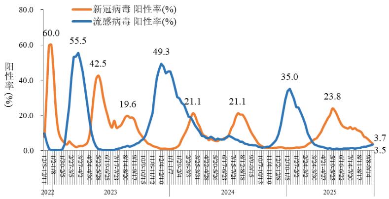 2025年第36周(9月1日-9月7日)至第39周(9月21日-9月28日),流感样病例新冠病毒阳性率持续下降,分别为11.1%、10.2%、8.0%和3.7%。见图4-2。