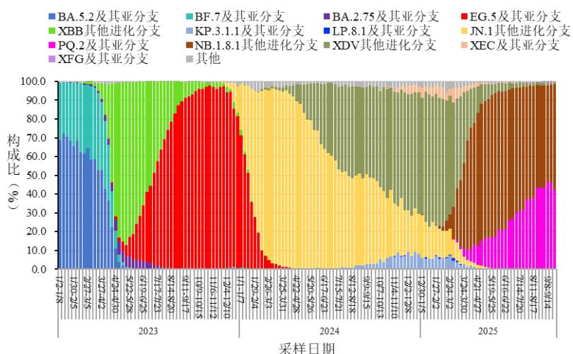 2025年9月1日-9月30日,全国31个省(自治区、直辖市)及新疆生产建设兵团共报送7237例本土病例新冠病毒基因组有效序列,均为奥密克戎变异株。主要流行株为NB.1.8.1及其亚分支(XDV变异株第六代亚分支)。根据采样日期,第36周(9月1日-9月7日)至第39周(9月22日-9月28日)NB.1.8.1及其亚分支占比分别为97.9%、97.8%、98.2%、98.4%。见图5。