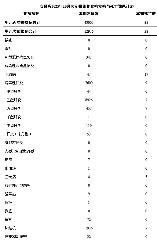 附件:安徽省2025年10月法定报告传染病发病与死亡数统计表