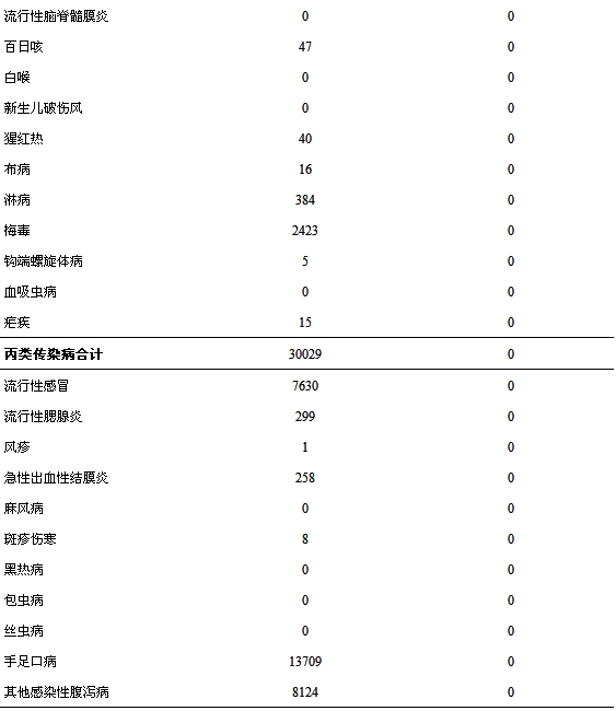 丙类传染病中除麻风病、黑热病、包虫病、丝虫病4个病种无发病、死亡报告外,其余7种丙类传染病共报告30029例,无死亡病例报告。报告发病数居前三位的病种依次为手足口病、其他感染性腹泻病、流行性感冒,占丙类传染病报告发病总数的98.12%。