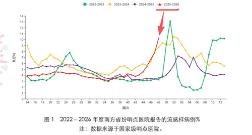 从图上可以看到,不论是代表南方省份的图1还是代表北方省份的图2,在整个监测季节的第48周(也就是大概每年11月最后一周),红色数据已经超越黄绿紫。