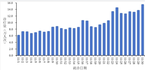 2025年11月1日-11月30日,全国31个省(自治区、直辖市)及新疆生产建设兵团各级各类医疗机构发热门诊(诊室)诊疗量,从11月1日的6.1万人次波动上升至11月30日的15.4万人次,呈波动上升趋势。见图1。
