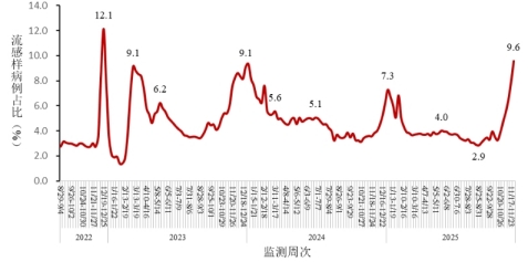 2025年第45周(11月3日-11月9日)至第48周(11月24日-11月30日),全国哨点医院流感样病例占门(急)诊就诊人数比例持续增加,分别为5.5%、6.5%、7.9%、9.6%。见图4-1。