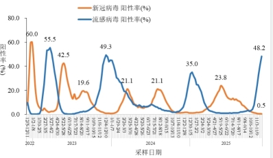 2025年第45周(11月3日-11月9日)至第48周(11月24日-11月30日),流感样病例新冠病毒阳性率持续下降,分别为0.8%、0.6%、0.6%、0.5%。见图4-2。