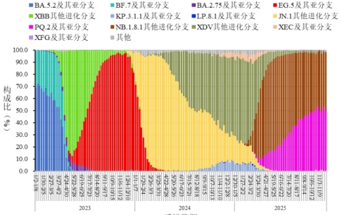 2025年11月1日-11月30日,全国31个省(自治区、直辖市)及新疆生产建设兵团共报送2535例本土病例新冠病毒基因组有效序列,均为奥密克戎变异株。主要流行株为NB.1.8.1及其亚分支。根据采样日期,第45周(11月3日-11月9日)至第48周(11月24日-11月30日)NB.1.8.1及其亚分支占比分别为98.9%、95.8%、98.5%、98.1%。见图5。