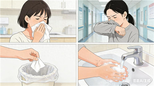 ★患者注意咳嗽礼仪,咳嗽、打喷嚏时用纸巾或肘部衣服掩住口鼻,用过纸巾等垃圾存放在垃圾袋中并及时处理,避免其他人接触,并做好手卫生,特别是擤鼻涕或处理污染物后,要及时洗手。