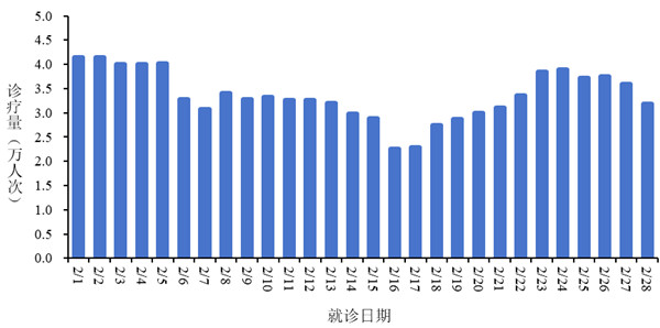 2026年2月1日-2月28日,全国31个省(自治区、直辖市)及新疆生产建设兵团各级各类医疗机构发热门诊(诊室)诊疗量,从2026年2月1日的4.1万人次波动下降至2月16日的2.3万人次,随后回升至2月24日的3.9万人次,之后下降至2月28日的3.2万人次。见图1。