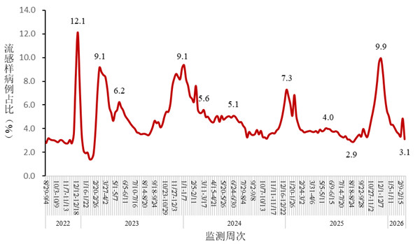 2026年第6周(2026年2月2日-2026年2月8日)至第9周(2026年2月23日-3月1日),全国哨点医院流感样病例占门(急)诊就诊人数比例呈波动下降趋势,分别为3.5%、3.3%、4.8%、3.1%。见图4-1。