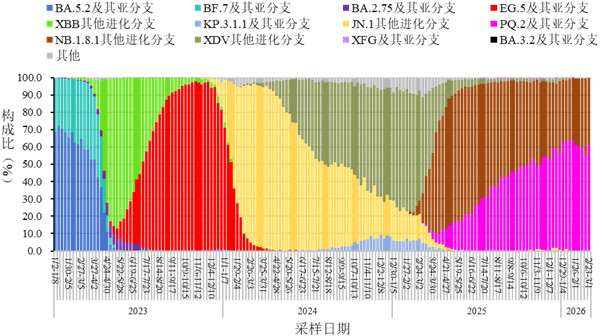 2026年2月1日-2月28日,全国31个省(自治区、直辖市)及新疆生产建设兵团共报送1784例本土病例新冠病毒基因组有效序列,均为奥密克戎变异株。主要流行株为NB.1.8.1及其亚分支。根据采样日期,第6周(2026年2月2日-2026年2月8日)至第9周(2026年2月23日-3月1日)NB.1.8.1及其亚分支占比分别为99.3%、99.3%、99.5%、100.0%。见图5。