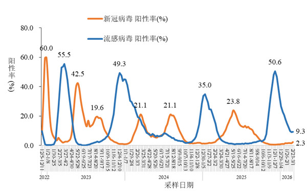 2026年第6周(2026年2月2日-2026年2月8日)至第9周(2026年2月23日-3月1日),流感样病例新冠病毒阳性率呈低位小幅波动增加,分别为1.6%、1.6%、1.5%、2.3%。见图4-2。