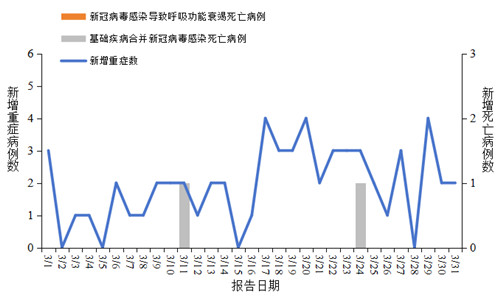2026年3月1日-3月31日,全国31个省(自治区、直辖市)及新疆生产建设兵团报告新增确诊病例26306例,其中重症病例60例、死亡病例2例(均为基础疾病合并新冠病毒感染死亡病例),报告病例数低位波动增加。见图2、图3。