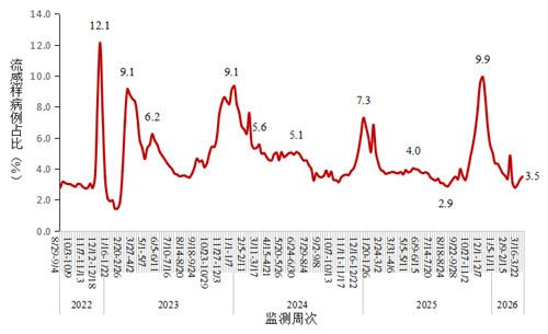 2026年第10周(2026年3月2日-2026年3月8日)至第13周(2026年3月23日-3月29日),全国哨点医院流感样病例占门(急)诊就诊人数比例呈小幅上升趋势,分别为2.8%、3.0%、3.3%、3.5%。见图4-1。