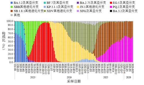 2026年3月1日-3月31日,全国31个省(自治区、直辖市)及新疆生产建设兵团共报送2714例本土病例新冠病毒基因组有效序列,均为奥密克戎变异株。主要流行株为NB.1.8.1及其亚分支。根据采样日期,第10周(2026年3月2日-2026年3月8日)至第13周(2026年3月23日-3月29日)NB.1.8.1及其亚分支占比分别为98.7%、99.1%、98.5%、100.0%。现有证据未提示出现可能构成额外公共卫生风险的新变异株。见图5。